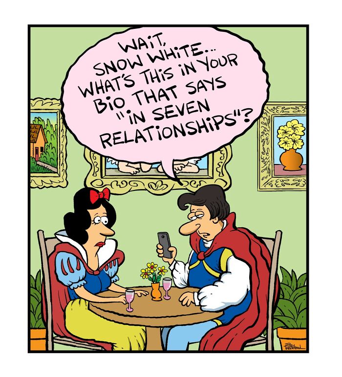 A comic shows Snow White sitting across from a prince at a table. The prince is looking at his phone and asks Snow White about her bio, which mentions being