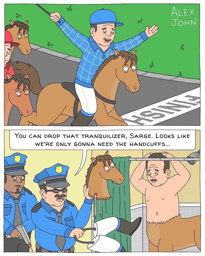 Okay, first of all, why is he wearing a horse costume in the shower? 😂 But also, I’m kinda impressed that a fake horse race landed him in this bizarre scenario. Now, I can’t stop wondering what the costume was for. Maybe next week’s comic should explain, ‘What happens in the shower stays in the shower?’ 🚿🐎