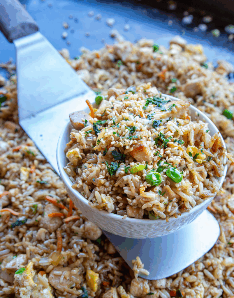 Quick and filling, this version features chopped chicken, scrambled eggs, peas, carrots, and green onions stir-fried with day-old rice and soy sauce.