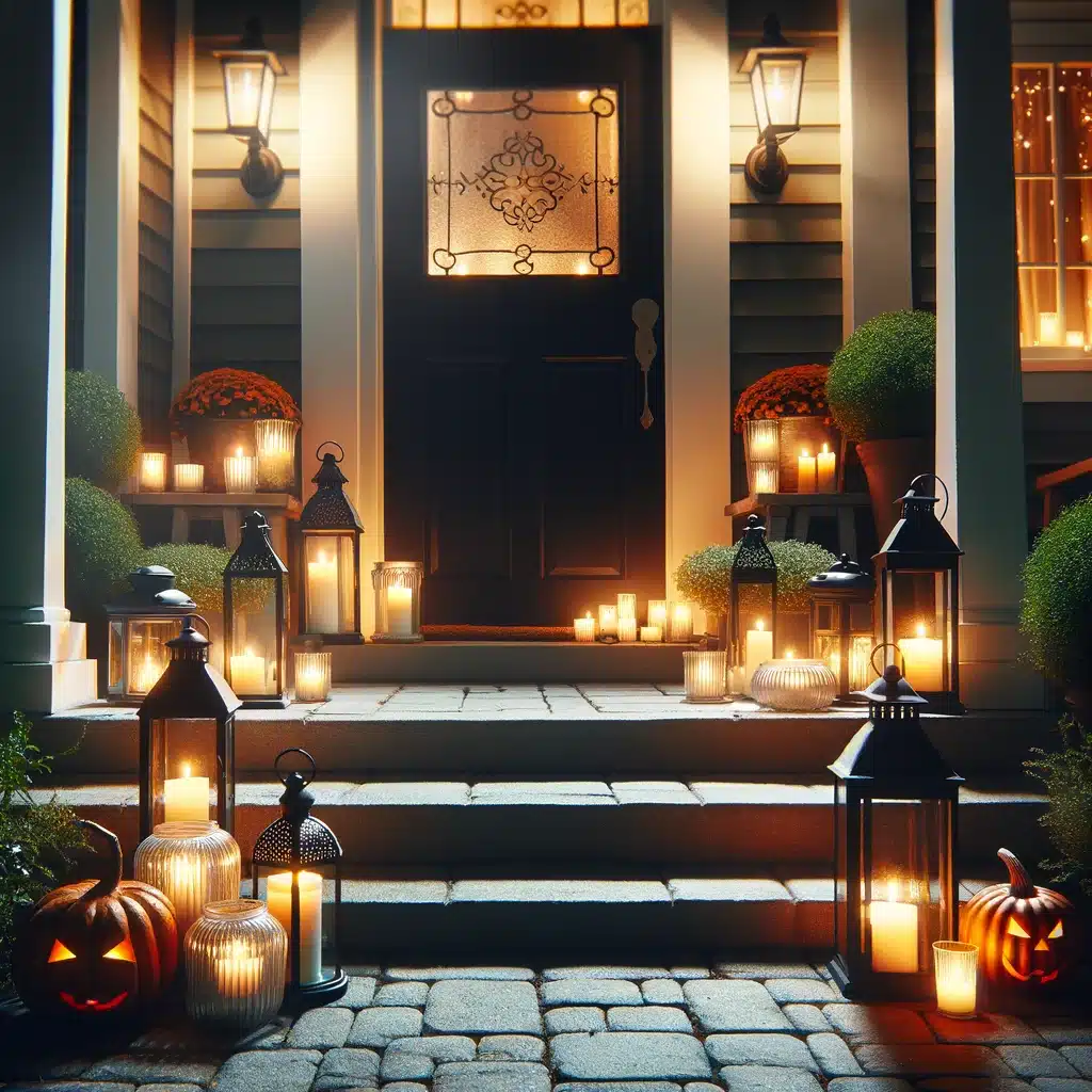 Lanterns and candles give off soft, flickering light that makes the environment more spooky. For safety and ease of use, use lamps that run on batteries. Place lights on steps, along paths, or as table centerpieces. For extra effect, use lights that have patterns or designs that look like Halloween. Candles that smell like fall, like cinnamon or pumpkin spice, can also make the mood better. Lanterns hung from porch ceilings or tree branches can make it look like ghosts are flying.