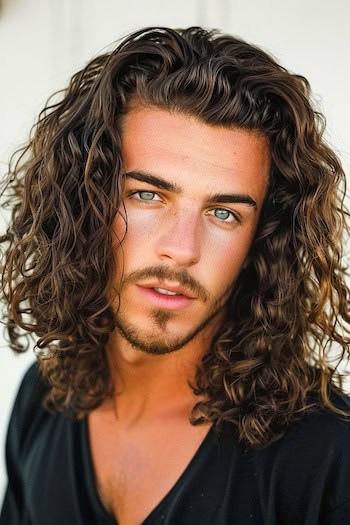 Let those curls roam free. This long hairstyle pairs beautifully with a full, well-groomed beard to create a strong, masculine contrast. The key here is balance — the beard grounds the length of the curls, keeping the overall look intentional. Perfect for men with medium to thick curl types who love a rugged vibe. Use a leave-in conditioner and a curl serum to keep everything soft and frizz-free.