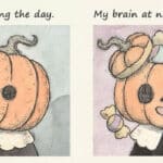 Ah yes, the perpetual morning mood—pumpkin on the outside, exhausted on the inside. This little pumpkin looks like it's about to ask if anyone else didn’t sleep last night either. We've all been there, buddy. Coffee, where art thou?