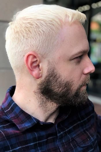 Take the traditional crew cut to the next level with platinum blonde hair and a crisp fade. This look is clean, bold, and modern — making even a simple cut feel fashion-forward. Use purple shampoo once or twice a week to maintain the cool tone and prevent brassiness. Great for guys who like short styles but still want to stand out.