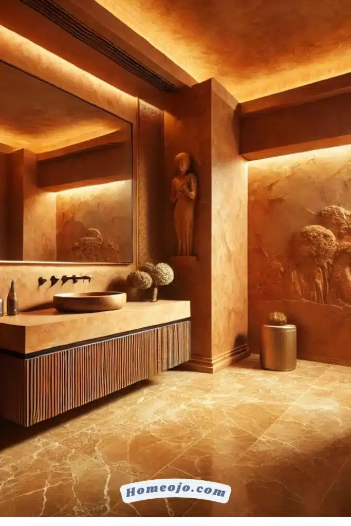 To improve the look of the earthy color scheme, add natural elements like woven baskets, stone floors and wooden vanities.